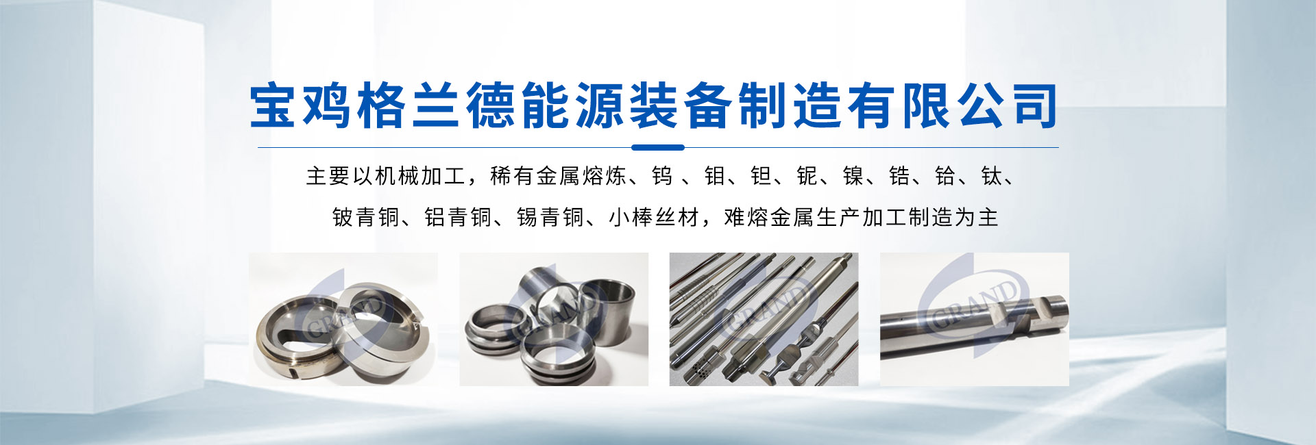 寶雞格蘭德能源裝備制造有限公司坐落于中國(guó)鈦都——寶雞,公司依托寶雞稀有金屬倉(cāng)儲(chǔ),主要以機(jī)械加工,稀有金屬熔煉,鎢 ,鉬,鉭,鈮,鎳,鋯,鉿,鈦,鈹青銅,鋁青銅,錫青銅,小棒絲材,難熔金屬生產(chǎn)加工制造為主,公司在深加工領(lǐng)域有先進(jìn)的多元化設(shè)備,為國(guó)內(nèi)外多家國(guó)有企業(yè)、上市企業(yè)提供板材、棒材、薄材、異形件等提供多元化加工服務(wù)。        寶雞格蘭德能源裝備制造有限公司近年來不斷完善配套產(chǎn)業(yè),為提高產(chǎn)品市場(chǎng)競(jìng)爭(zhēng)力,先后成立精加工事業(yè)部,稀貴金屬事業(yè)部,鈦材料事業(yè)部,鍛造事業(yè)部,鈑金焊接事業(yè)部,熱處理事業(yè)部,···